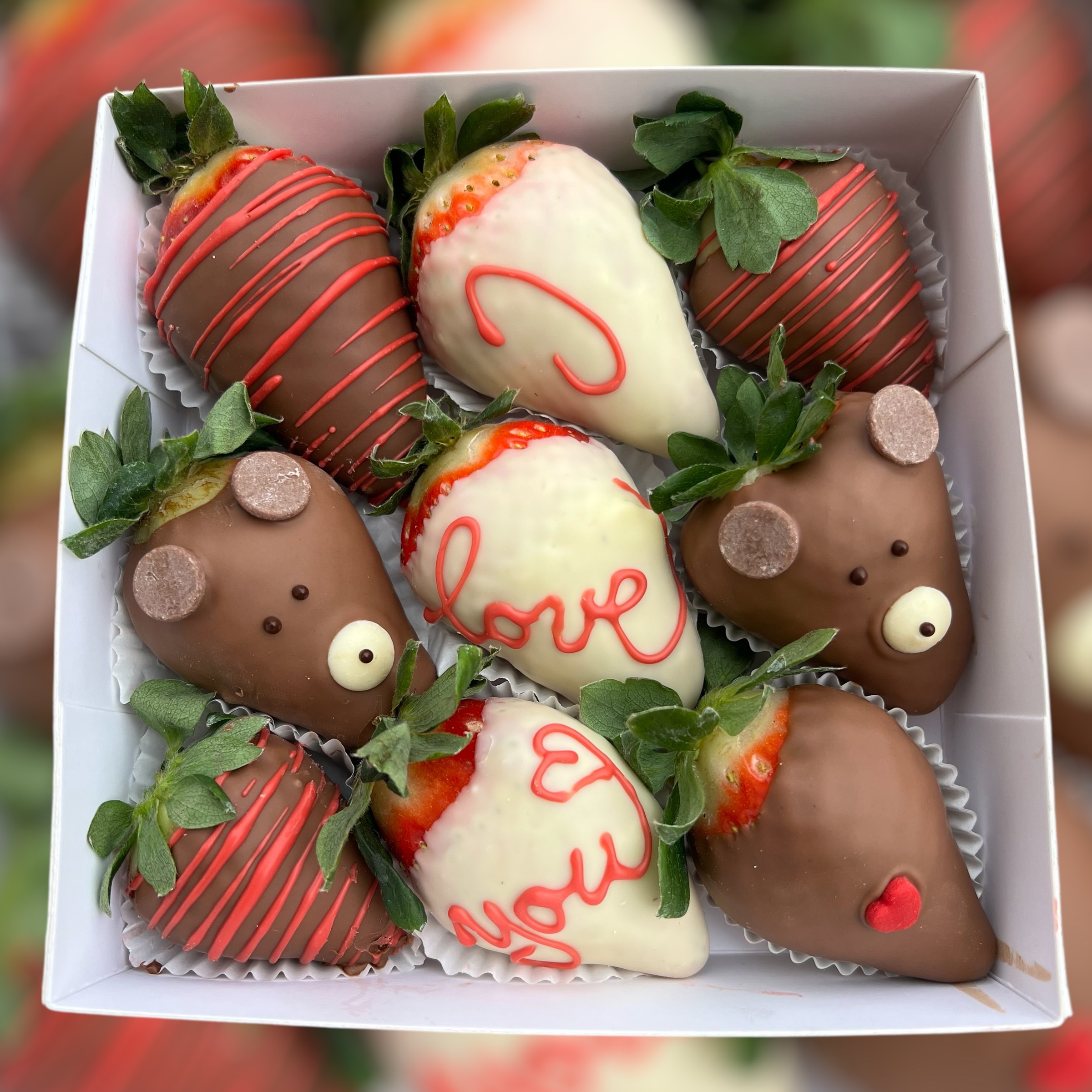 V bonboniérke je 8-10 ks jahôd a srdiečko s nápisom Ľúbim Ťa...
