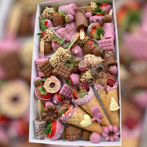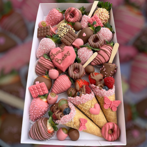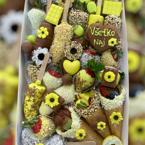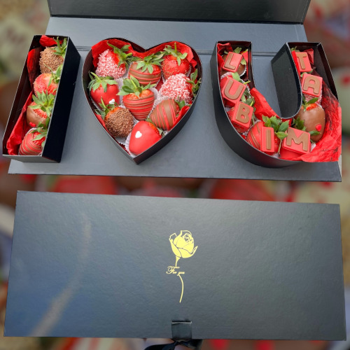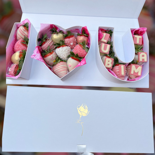 Box obsahuje 20-26 ks jahôd podľa veľkosti a nápis “LUBIM TA...