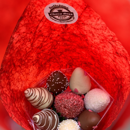V bonboniérke je 8-10 ks jahôd a čokoládový macko.
